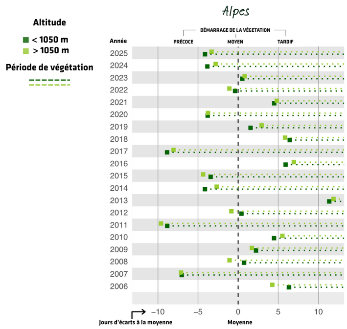 Des valeurs au-dessus de 0 indiquent un démarrage tardif de la végétation par rapport à la moyenne depuis 2004, alors que les valeurs en dessous de 0 indiquent un démarrage précoce de la végétation.